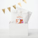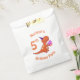 Custom dinosaur birthday party bags for kids with happy T-Rex carrying a cupcake and wearing a party hat for the occasion.