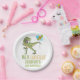 Cute 3rd birthday paper plate of a little boy featuring a happy tyrannosaurus and some green, blue and orange balloons and a decorative green heading. Great for a little boy who likes dinosaurs, is turning three and is having a t rex dinosaur themed third birthday party.