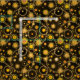 A beautiful spray of gold sun forms, with wheels or gears of celestial mechanics and stardust on deep space black.