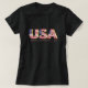 The letters U S A in the stars and stripes, red white and blue, of the American flag with gold edging
