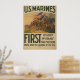 U.S. Marines recruitment poster from World War I showing a group of marines rushing into battle carrying the American flag and the flag of the Marine Corps. Created by Frederick Coffay Yohn