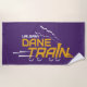 The UAlbany Dane Train logo features bold, angular typography with the words "Dane Train" in large, purple capital letters. Above it, "UAlbany" is written in a smaller, golden font. The design incorporates the silhouette of a train, with smoke billowing from the smokestack. The train's wheels are represented in gold, giving the appearance of movement, and golden streaks on the left emphasise speed and momentum. The logo exudes a dynamic and energetic vibe, combining elements of strength and motion, reflecting a sports or team spirit.