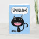 Udvözlöm! Hello greeting card written in Hungarian. Illustration of a black cat with a fish skeleton at its feet. Colored in blue, black, white, and pink. Illustration has a cartoon look and is a stylized design. Blank inside for your personal message. Image and verse © Shoaff Ballanger Studios / 2015.