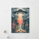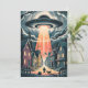 This dramatic illustration depicts a UFO hovering above a quiet suburban street at dusk, casting a vivid orange-yellow beam over houses and a lone figure observing the spectacle. Rich, moody colors of deep blues, purples, and grays contrast with the glowing beam, creating a retro-inspired, surreal atmosphere. Bold outlines and stylized details make this artwork perfect for fans of sci-fi, mysterious phenomena, and cinematic night scenes.