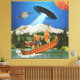 Modern Collage Wall Art. THis one is vintage retro icons with UFO spaceship, vintage postcard elements of a canoe trip with forest & Mountain landscape and planets in the night sky. Colours of oranges, red and green. Fun, mod and eclectic ephemera. This is a flat surface with a smooth canvas finish. Fun, surreal art using a mix of collage and digital art techniques, with a vintage, mid-century retro feel.