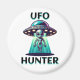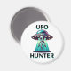 Alien and UFO graphic for those into UFOlogy. A cute alien being breamed down from a UFO. Text says, "UFO Hunter" in black and turquoise magnet.