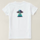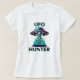 Alien and UFO graphic for those into UFOlogy. A cute alien being breamed down from a UFO. Text says, "UFO Hunter" in black and turquoise women's shirt.