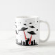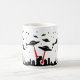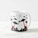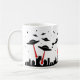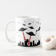 This mug features a repeated design of UFOs, with red lasers, invading a city. The background colour can be customised if desired.