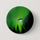 UFO hovering over spruce trees at night with green northern lights in the background.
