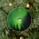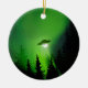 UFO hovering over spruce trees at night with green northern lights in the background.
