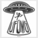 Vector cartoon illustration of a UFO abducting a person that thinks aliens rock with UFOMG text. Tags: UFO, OMG, unidentified, flying, object, oh, my, god, space, spaceship, alien, martian, cartoon, devil, horns, abduction, fourth, kind, humour, saucer