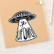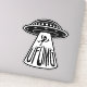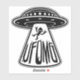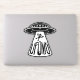 Vector cartoon illustration of a UFO abducting a person that thinks aliens rock with UFOMG text. Tags: UFO, OMG, unidentified, flying, object, oh, my, god, space, spaceship, alien, martian, cartoon, devil, horns, abduction, fourth, kind, humour, saucer