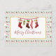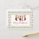 A holiday greeting postcard with a repeating pattern in the background, in an ugly Christmas sweater style. The pattern is composed of socks, christmas balls, stars and snowflakes. With the repeating Merry Christmas text in red. Fun and festive. Layered over top is a white rectangle with a faux gold foil border, inside is an illustration of old-fashioned hanging stockings and the text "merry Christmas. The back has a message which you can personalise.