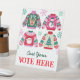 This ugly sweater 'cast your vote here' sign features 4 christmas sweaters with lots of fun christmas icons such as Santa, Reindeer, a Snowman and a Christmas Tree surrounded by snowflakes in a colour palette of red, green and pink. You can customise the text. See the whole matching collection.