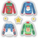 Four colourful ugly sweaters and gold glitter stars (not real glitter).