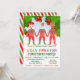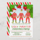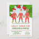 This modern design is perfect for an Ugly Sweaters Party. Why? It features these three Christmas traditional characters wearing an ugly sweater, gloves, and a matching Christmas hat: Santa Claus, Rudolph the Reindeer, and a Polar bear. They are holding hands because they are singing a Christmas carol, well, maybe. There's also some beautiful Holy, with prickly leaves and red berries. It's a simple but festive proposal for the holiday. The back of this invitation has stripes in green, white, and red. The text is easy to personalise with your own details. You can pick another font, colour, or size for the text, except for the words UGLY SWEATER.