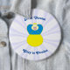 Ukrainian Flag is blue on top and yellow on the bottom. Here, we have an angel dressed in the blue and yellow flag of Ukraine. Background is white, sunburst streaks. Above, in blue letters reads SLAVA UKRAINI. Below, in the same colour are the words GLORY TO UKRAINE. Shows here on an extra large button. You can choose from various sizes to fit your need and your budget..
