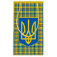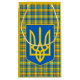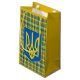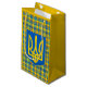 Rustic gift bag fashionable wrapping featuring yellow and blue plaid pattern laced with red, black colours. Tartan inspired by Ukraine colours with Ukrainian Tryzub emblem.