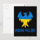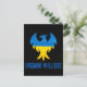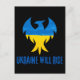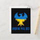 An inspirational postcard design that echoes the resilience of the Ukrainian people features a phoenix bird silhouette in the blue and yellow colours of Ukraine's flag with "Ukraine will rise" text in distressed font.