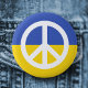Ukraine anti war button featuring a white peace symbol on a blue and yellow ukranian flag background.