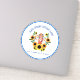 Beautiful car decal features centre folk art style Ukrainian girl in traditional costume with large sunflowers wreath and the national salute "Glory to Ukraine! Glory to Heroes!" in both English and Ukrainian. Blue and yellow Ukraine flag colour borders