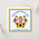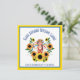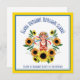 Colourful square flat greeting card features centre folk art style Ukrainian girl in traditional costume with large sunflowers wreath and the national salute "Glory to Ukraine! Glory to Heroes!" in both English and Ukrainian. Blue and yellow Ukraine flag colour borders