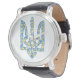 Ukrainian national emblem trident tryzub in Ukrainian flag colours and ethnical pattern