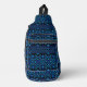 Ukrainian traditional vushuvanka folk pattern sling bag. Dark blue and light blue colour pattern on the black background.