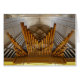 A close-up view of the Walcker organ pipes in Ulm Munster, Germany, looking up towards the ceiling.