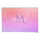 On front: Soft pastel colours in violet, pink, peach and warm yellow, almost like a rainbow. Template for your name and monogram letter. White and violet coloured letters.