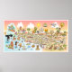 Bright and detailed whimsical vision of Southern California - featuring Los Angeles and San Diego and Orange County plus many major cities and most beach towns - zany characters play on the beach and desert, mountains and valleys. This charming scene has it all – a surfer hangs ten while a mermaid lounges on a rock, a killer whale leaps out of the water as a t-rex roars a challenge, a muscular beach couple both flex to impress, zoo animals wait for tourists and a bull smashes into a bull fighter… And MUCH more...
