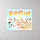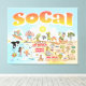 Bright and colourful art offers a spectacular view of Southern California - wacky characters frolic on the beach and desert of SoCal showcasing Los Angeles, Orange County, San Diego, Santa Barbara, Riverside, Palm Springs, El Centro, Anza Borrego and Joshua Tree parks as well as the border cities of Tijuana, Tecate and Mexicali. This charming scene has it all – a surfer hangs ten while a killer whale leaps out of the water, zoo animals greet the tourists, a muscular fellow flexes to impress as a T-Rex roars a challenge and a tank moves into position and much more…