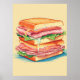 A deliciously detailed illustration of a towering triple-layer sandwich, featuring toasted bread, layers of thinly sliced ham, crisp lettuce, and oozing melted cheese. The textures and vibrant colours bring out the richness of this gourmet meal, making it a feast for both the eyes and the appetite.