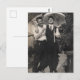 This postcard features two handsome, sharply dressed men from the 1940s standing under umbrellas and laughing.