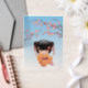 Vector illustration of a cute oriental girl in a peach colour kimono dress with wide plum obi sash holding a pink kinchaku drawstring bag. The girl's black hair is decorated with ribbons and geisha style hairpins. The doll is named after Japanese ume tree that is related to both plum and apricot trees. This artwork was inspired by traditional kokeshi dolls of Japan. Light blue background is decorated with blooming ume tree branches.