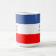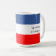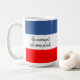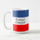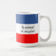 Say it clearly to all around, and say it in French. You need a minute. Un moment, s'il vous plaît translates as "a moment, please". Make a declaration of independence. Carve out your moment of peace and quiet in the morning before you tackle the day. The words appear in script, imposed on an endless blue, white and red stripes, in the style of the French flag. Message appears on both sides.
