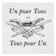 Poster with a design refering to Alexandre Dumas book "Les Trois Mousquetaires" - "The Three Musketeers". This historical novel tells the story of four heros and friends: d'Artagnan, Athos, Aramis and Porthos. They shared the motto "Un pour Tous et Tous pour Un" - "All for One and One for All". It takes place in 17th century France. The symbol is inspired by a French plate of this time.