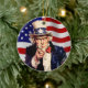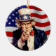 Round ceramic ornament with a vintage 1940s image of Uncle Sam on the American flag. The back is navy with optional text. See the entire Patriotic 40s Ornament collection in the PARTY FAVORS section.