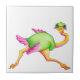 A very uncommon ostrich running flaunting his rainbow-coloured feathers.