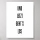 Und jetzt geht's los, and now it begins in German. Typography in black and (transparent) white. You can change the background color.