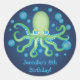 Adorable under the sea green and blue octopus birthday party stickers. These stickers feature a very cute octopus with eight legs and bubbles around him. The octopus has large and cute eyes and he is floating above the ocean floor. These stickers are so cute for a birthday party for kids and teens. Great for boys and girls.