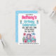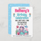 Adorable under the sea birthday invitations featuring a happy mermaid with a cute smile and rosy pink cheeks. She has long flowing white hair adorned with little pink and blue flowers. She is wearing a pink shell bikini top and has a fish tail with green scales. She is sitting surrounded by pink, blue and green shells and blue, pink and green coral. There is a happy pink starfish and a blue striped fish with her and hearts and bubbles floating around her. Above the image are templates in black, blue and pink text to add all your party details including name, date, time, address and contact details.