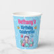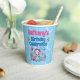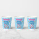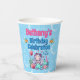 Adorable under the sea birthday party cups featuring a happy mermaid with a cute smile and rosy pink cheeks. She has long flowing white hair adorned with little pink and blue flowers. She is wearing a pink shell bikini top and has a fish tail with green scales. She is sitting surrounded by pink, blue and green shells and blue, pink and green coral. There is a happy pink starfish and a blue striped fish with her and hearts and bubbles floating around her. Above the image are templates in blue and pink text to add all your party details.