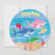 One fish, two fish, three fish, FOUR. An under the sea themed 4th birthday party invitation for a girl or boy. Colourfully illustrated, four cartoon sharks swim in an ocean filled with baby fish and colourful coral. The back of this sweet invitation card also features the ocean baby fish and coral. Both sides of the card can be customised, with the main text on the back.