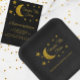 Under the stars, birthday, quinceanera and sweet 16 events. Black night sky background with gold moon and stars