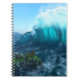 A massive wave leaps up from rough seas, sparkling white and blue and turquoise in the blazing sunlight. Under the wave, about to be submerged, is a little town with a castle and mediaeval cottages built on a rocky headland.