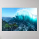 A massive wave leaps up from rough seas, sparkling white and blue and turquoise in the blazing sunlight. Under the wave, about to be submerged, is a little town with a castle and mediaeval cottages built on a rocky headland.