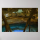 An underground spring and its wooden staircase to the dive landing. A ceiling hole in the cave has ivy vines peeking down into it.
