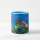Swimming with the tropical exotic sea turtles! Vibrant photo shot diving just below the surface of the blue tropical sea waters. Watching the sea turtle swim around the coral reef with small colorful tropical fish nearby. Sea turtles can live up to 100 years, hold their breath underwater for up to 5 hours at a time, eat jellyfish, and can weigh up to 2,000 LBS.