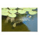 A Turtle swimming in a pond full of lily pads.